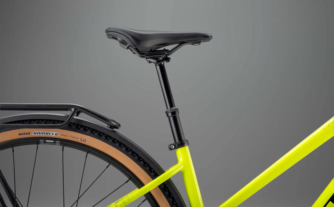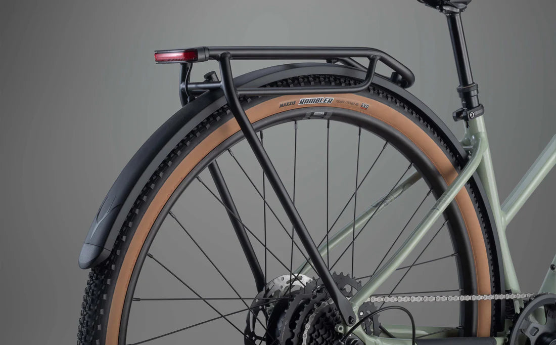 – Fully equipped and ready for everything with integrated front and rear lights, alloy mudguards, rear storage rack, 'dropper' seatpost, and kick-stand.