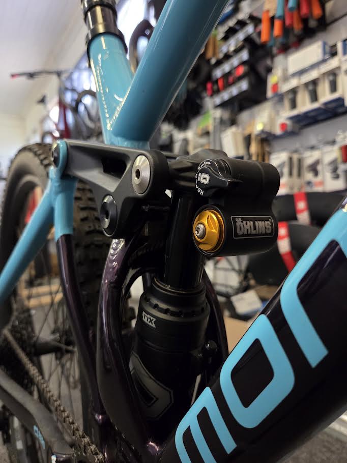 Öhlins TTX Air 205x62.5mm. Settings: high speed compression lever with climb mode, low-speed compression, rebound, air preload. Trunnion top mount, 22.2x10mm bottom bushings
